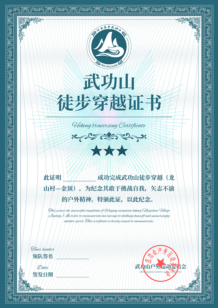 成功徒步穿越武功山者,颁发珍藏版电子证书
