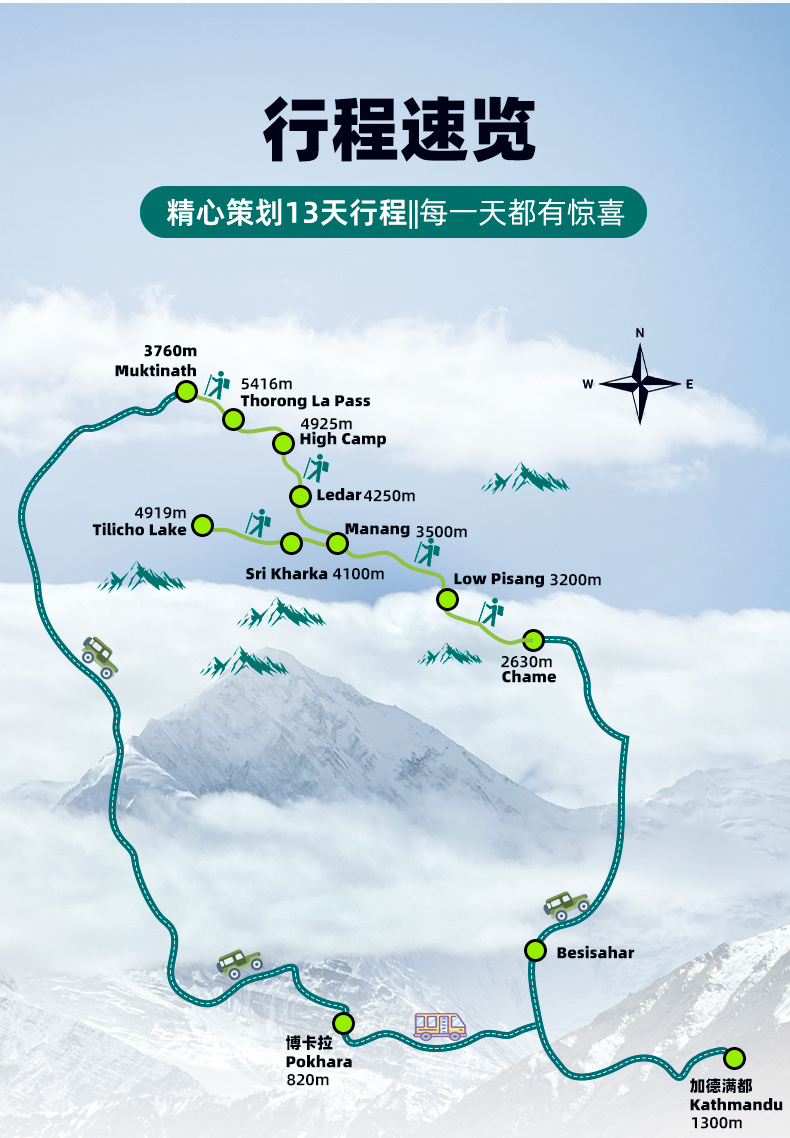 3、交通:加德满都到徒步起点为越野车,去程不经过博卡拉,徒步终点到博卡拉为越野车,博卡拉到加德满都为豪华大巴;