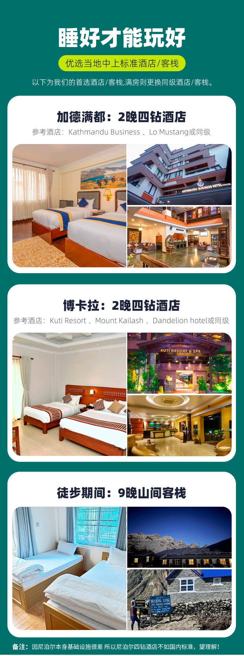 1、酒店:全程12晚住宿,加德满都2晚(四钻),博卡拉1晚(四钻),山间客栈9晚;