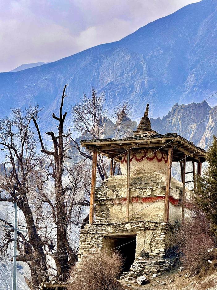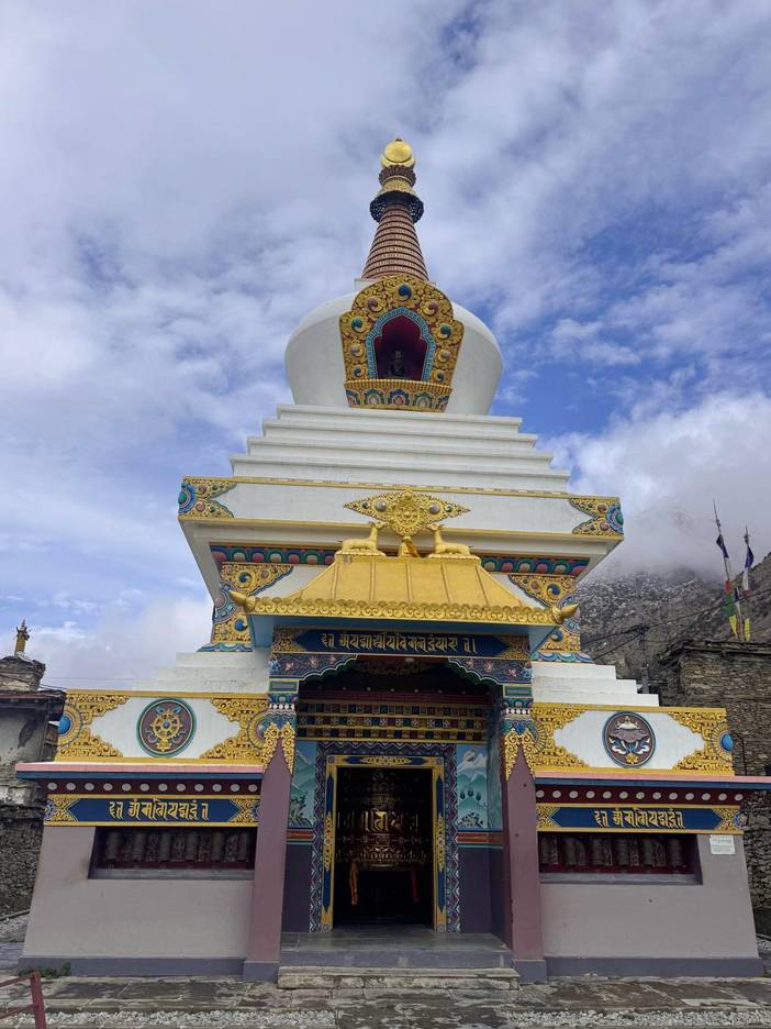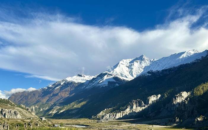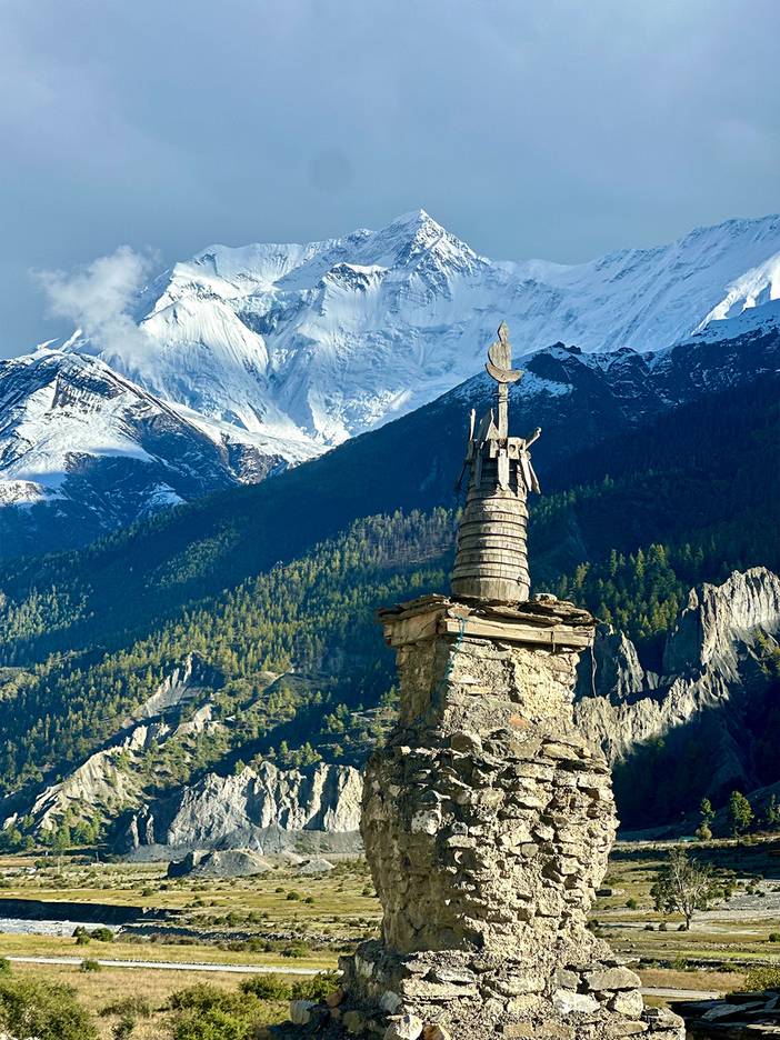 【行程概述】今天是我们正式开始徒步的第一天,从Chame出发,沿河谷徒步至Low Pisang,全程约12公里,耗时6小时。沿着马杨迪河支流徒步,河谷两岸梯田错落有致,溪流潺潺相伴。远处安娜普尔纳Ⅲ峰(7555m)和Ⅳ峰(7525m)的雪峰刺破云层,在阳光下闪耀。今日途经多个藏族村落,经幡在风中飘动,藏式石屋点缀山间。Low Pisang村保留着传统的藏族生活方式,村内的古老佛塔和经堂见证了藏传佛教文化的影响。