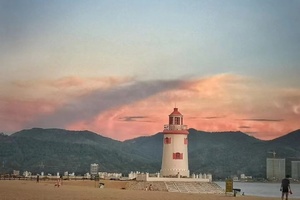 酒店楼下有无边泳池、沙滩、灯塔,大海